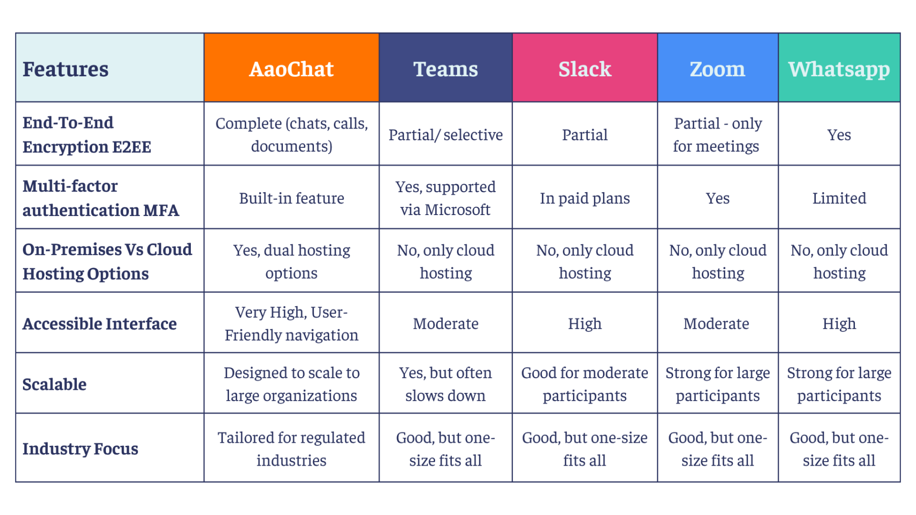 While Microsoft Teams, Slack, Zoom, and WhatsApp each have their strengths, they fall short in critical areas for enterprises that prioritize privacy and control. AaoChat - the best secure messaging app- bridges this gap, offering a secure, compliant, and user-friendly communication platform that empowers teams without compromise.
